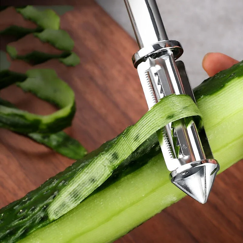 ✓ Multifunctioneel – De 3-in-1 Schilmesje™ kan op drie verschillende manieren worden gebruikt voor groenten en fruit. Het heeft een gatengraver aan het uiteinde om gemakkelijk holle gaten te verwijderen. Hij heeft ook een shredder om voedsel te versnipperen en een dunschiller om de schil te verwijderen