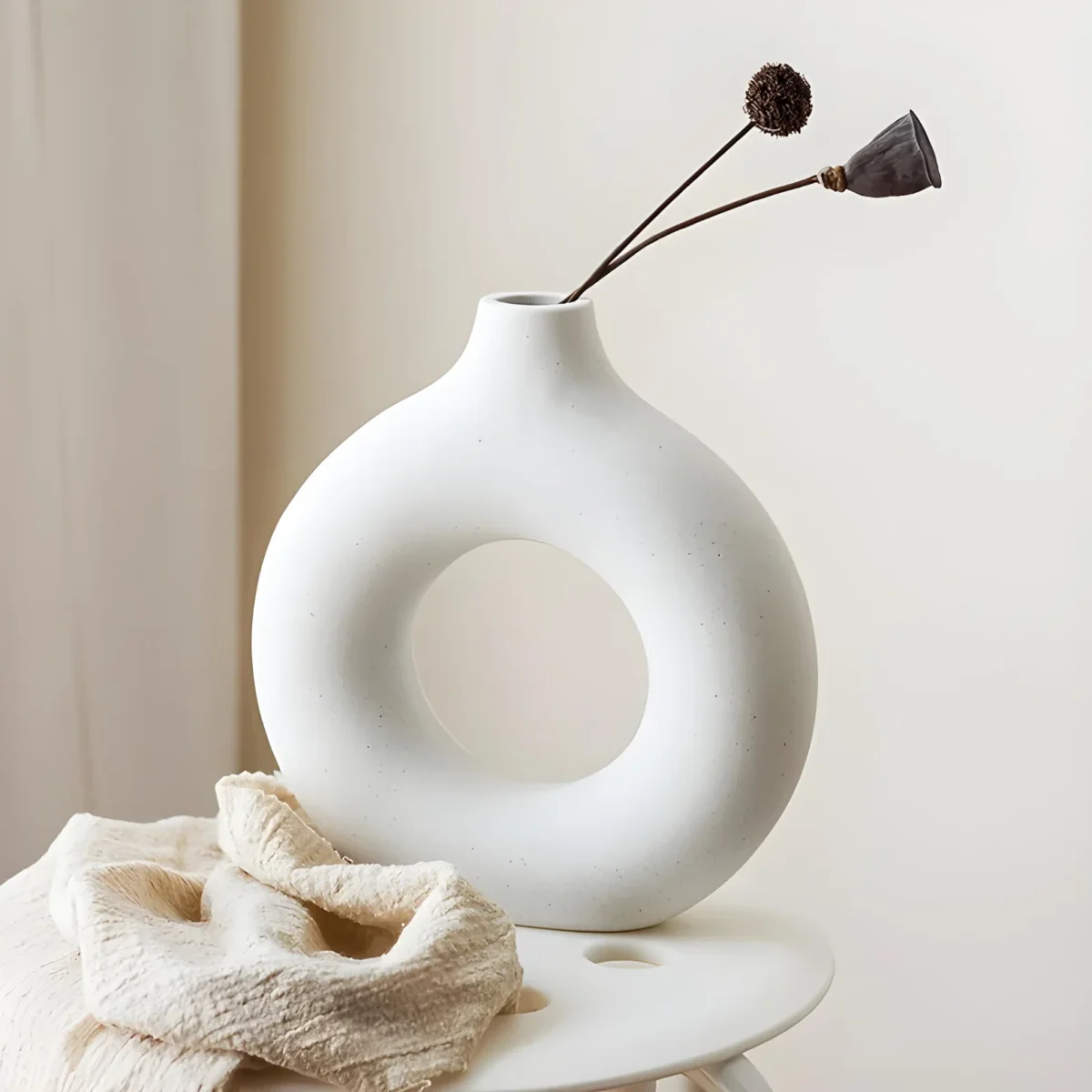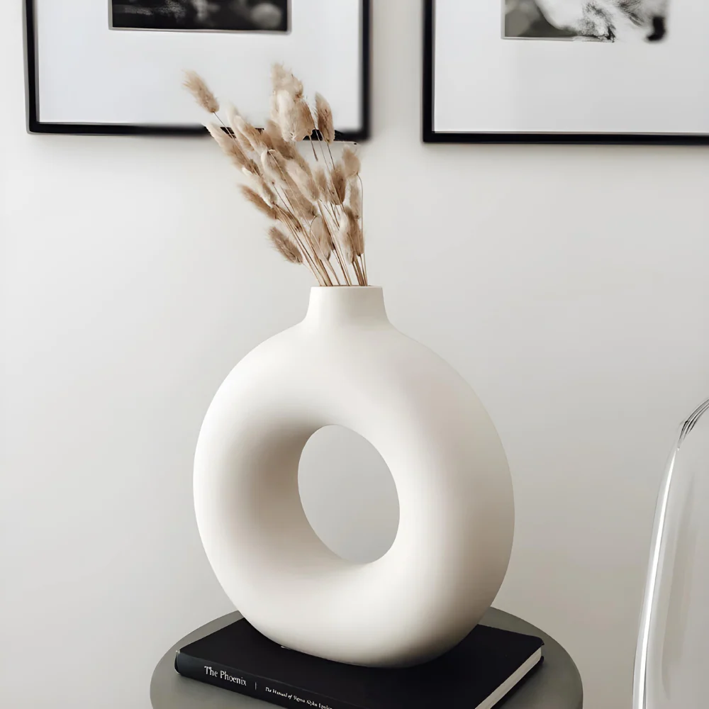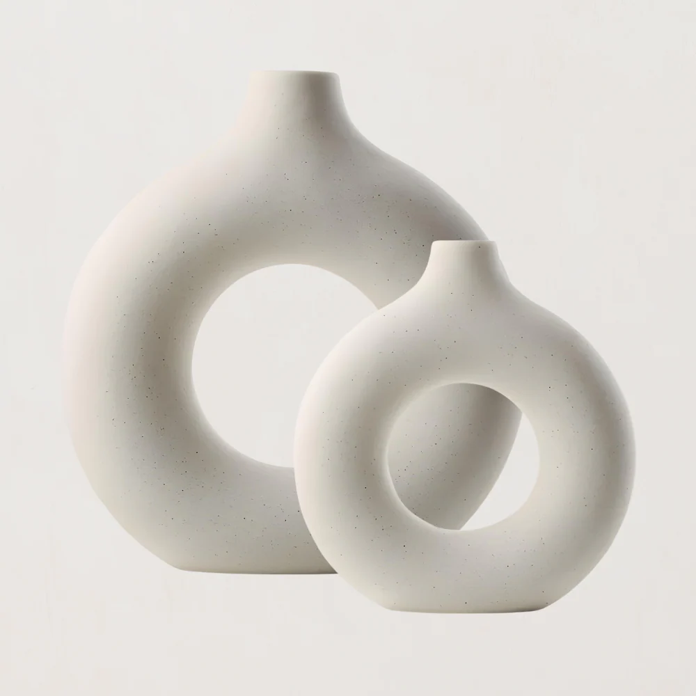 Transformeer uw woonruimte met deze verbluffend unieke, matwitte keramische vazen, ontworpen om naadloos in elke interieurstijl te passen. Elke vaas is vervaardigd met een verfijnd rond silhouet en geeft een avant-gardistische draai aan traditioneel design, waardoor ze perfect zijn als op zichzelf staande stukken of gecombineerd voor een harmonieuze look.