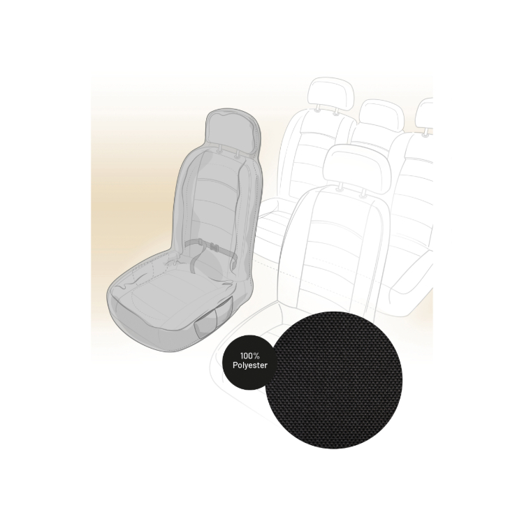 Het polyester autodeken is waterdicht en krasbestendig. Het is geschikt voor een enkelzit in de meeste automerken en wasbaar op 30°C. Het deken is eenvoudig te bevestigen aan de stoel met elastiek en kliksluiting en heeft 4 opbergvakken.