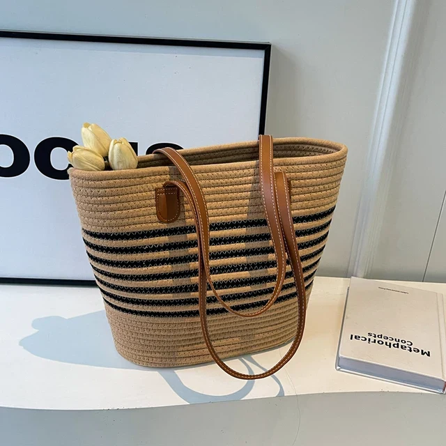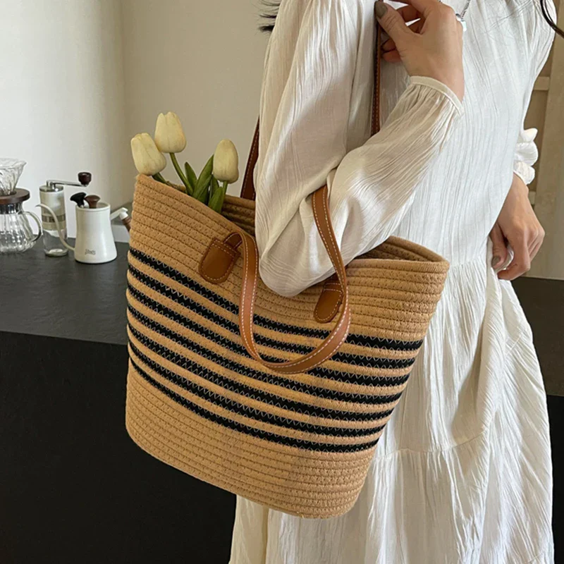 Deze gestreepte stro tote tas combineert stijl en functionaliteit voor uw strand- en winkelervaringen. Met zijn ruime capaciteit en boho-geïnspireerde design is deze tas de perfecte metgezel voor uw dagelijkse avonturen.