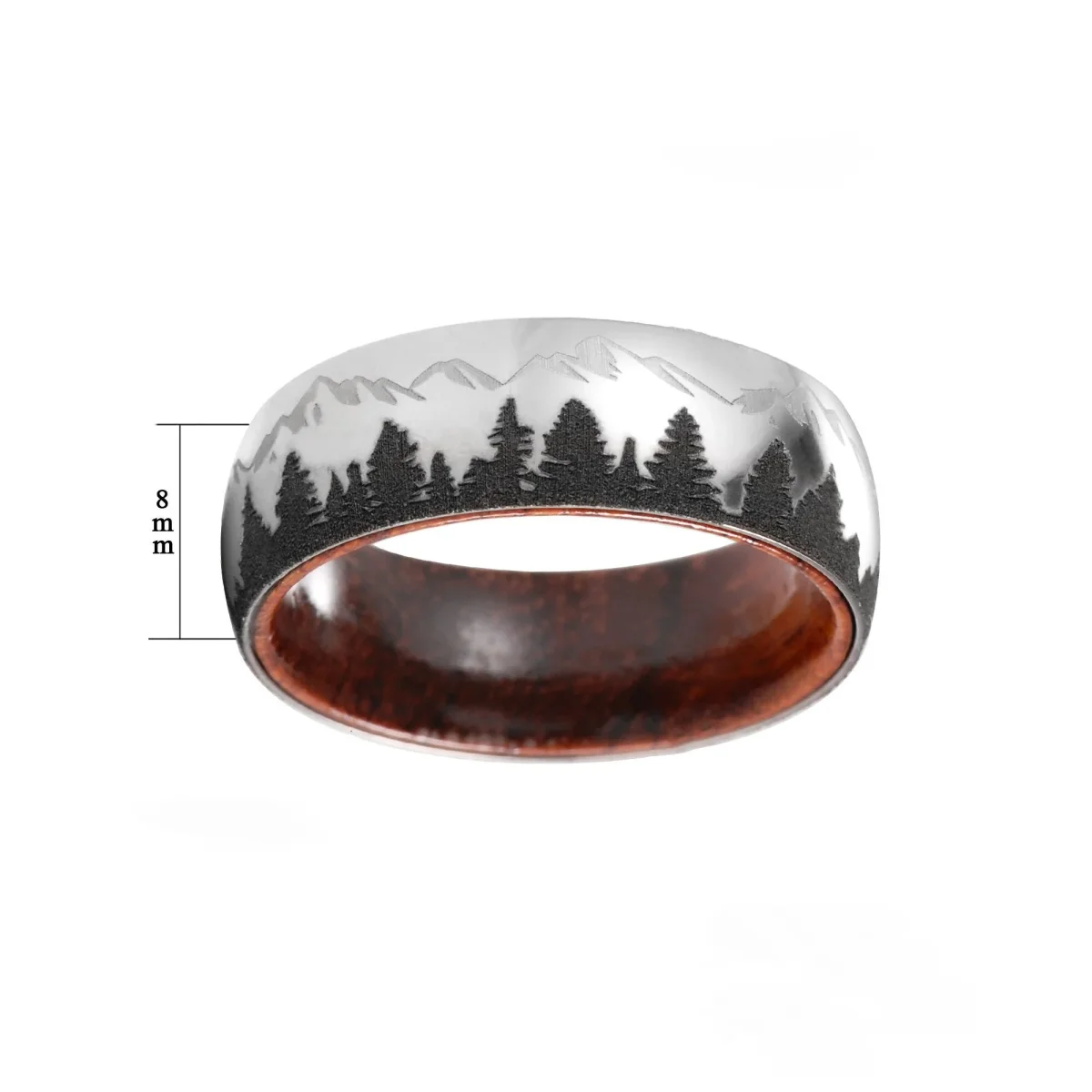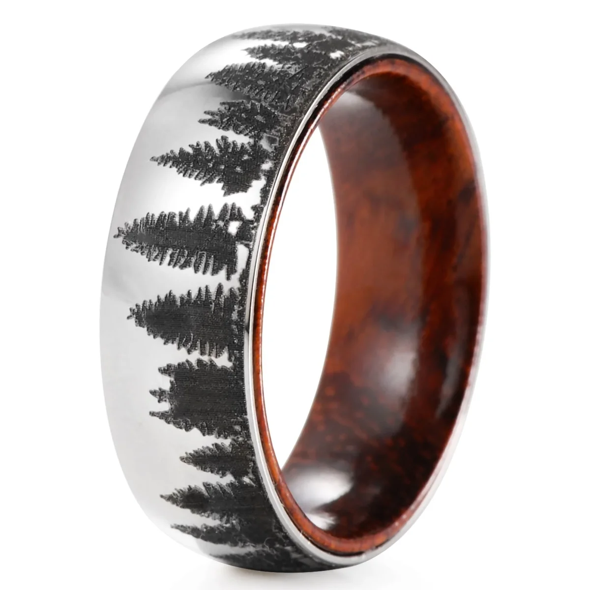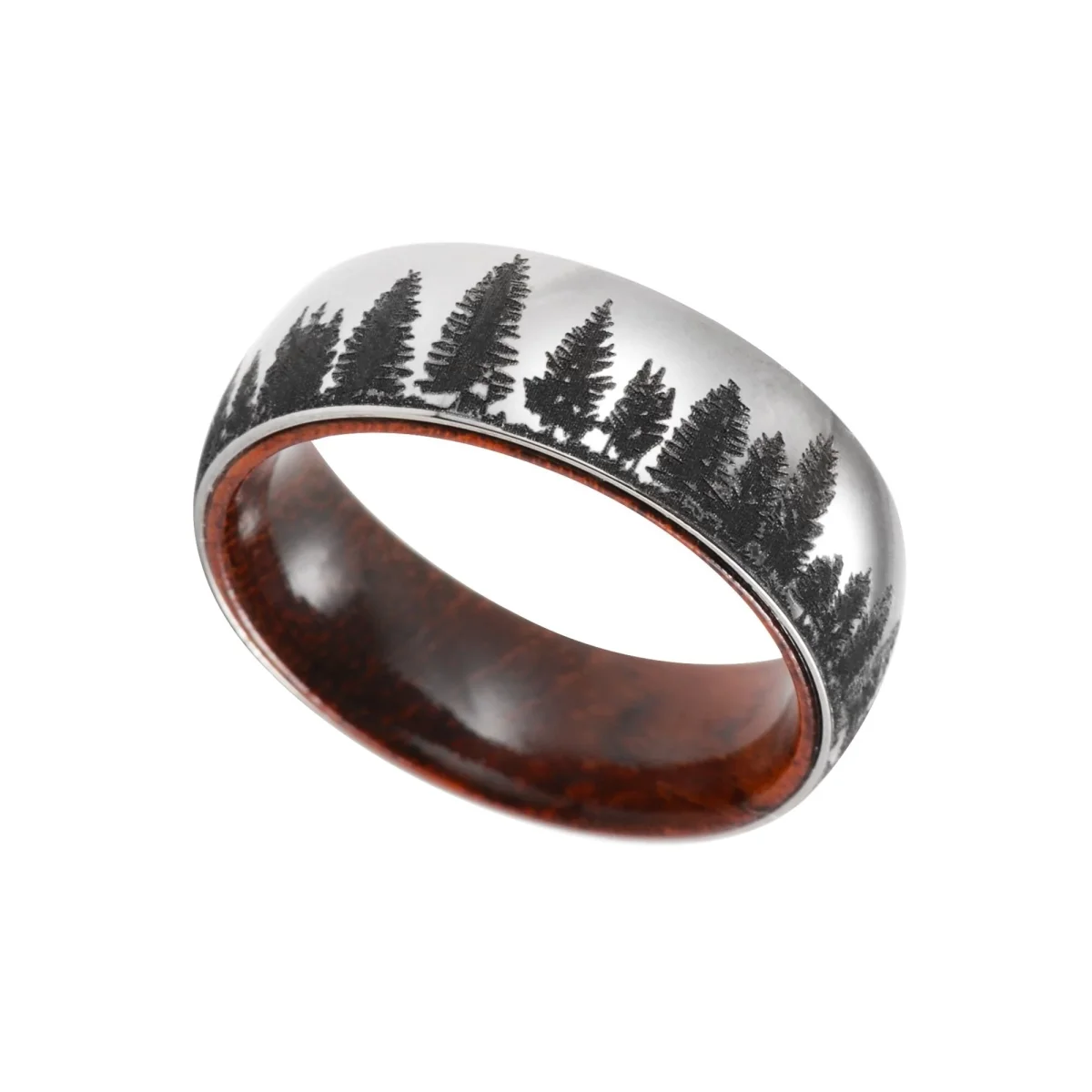 Geen wandelexpeditie is compleet zonder de juiste uitrusting. Neem deze prachtige hoogglans gepolijste zilveren Titanium band mee als je gids, met een gladde palissander binnenkant en een prachtig dennenbos geëtst rond de buitenkant van de band.