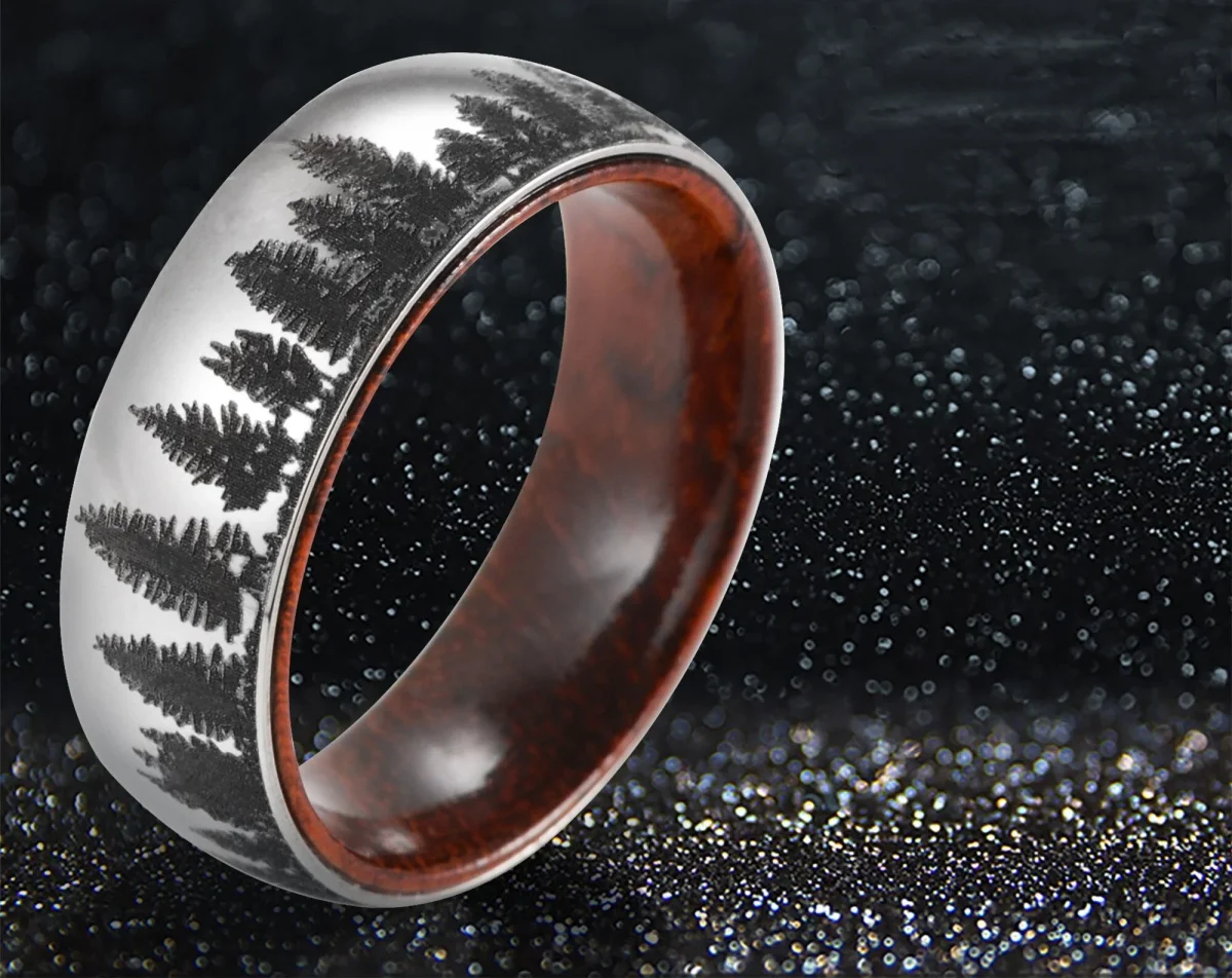 - NATUURLIJK MODERN: Tijdloos en toch eigentijds deze 8mm ring heeft een bos landschap ingewikkeld laser-geëtst in een wolfraamcarbide band, geborsteld met een matte afwerking, en vervolgens gepolijst voor een consistente gladde textuur.
