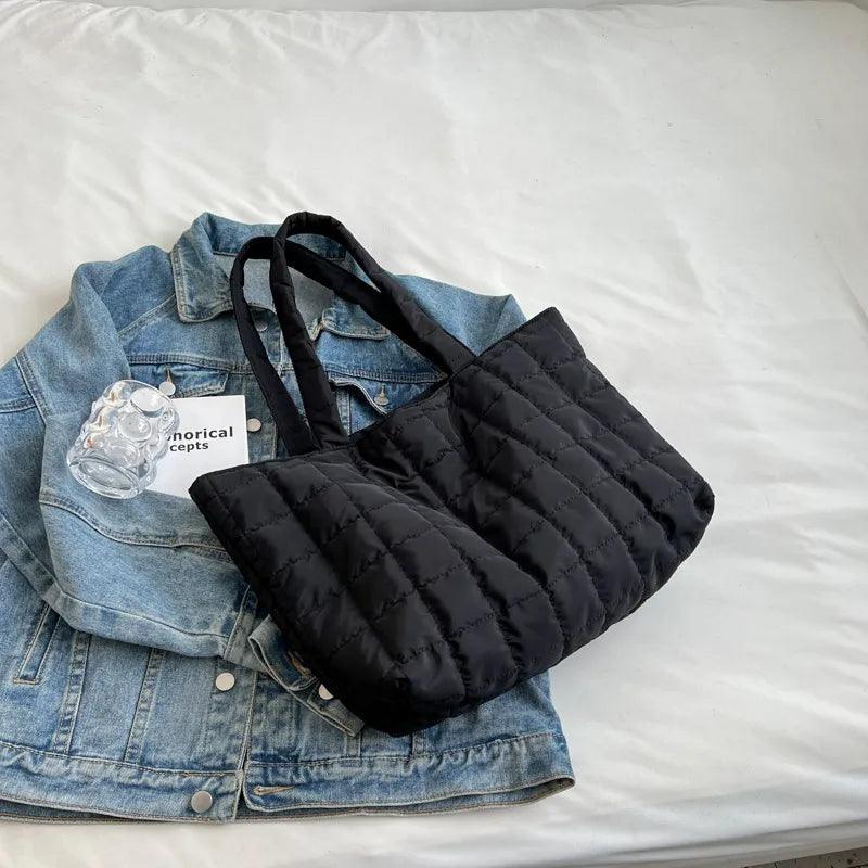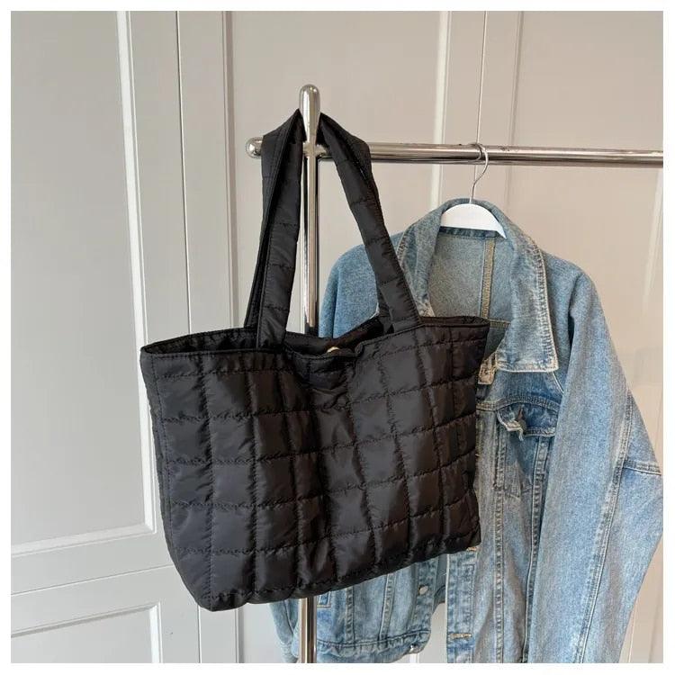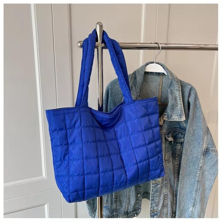 Deze grote winterschoudertas in kobaltblauw heeft een gewatteerd blokjespatroon en zacht, lichtgewicht materiaal. De twee brede handgrepen zijn comfortabel voor dagelijks gebruik.