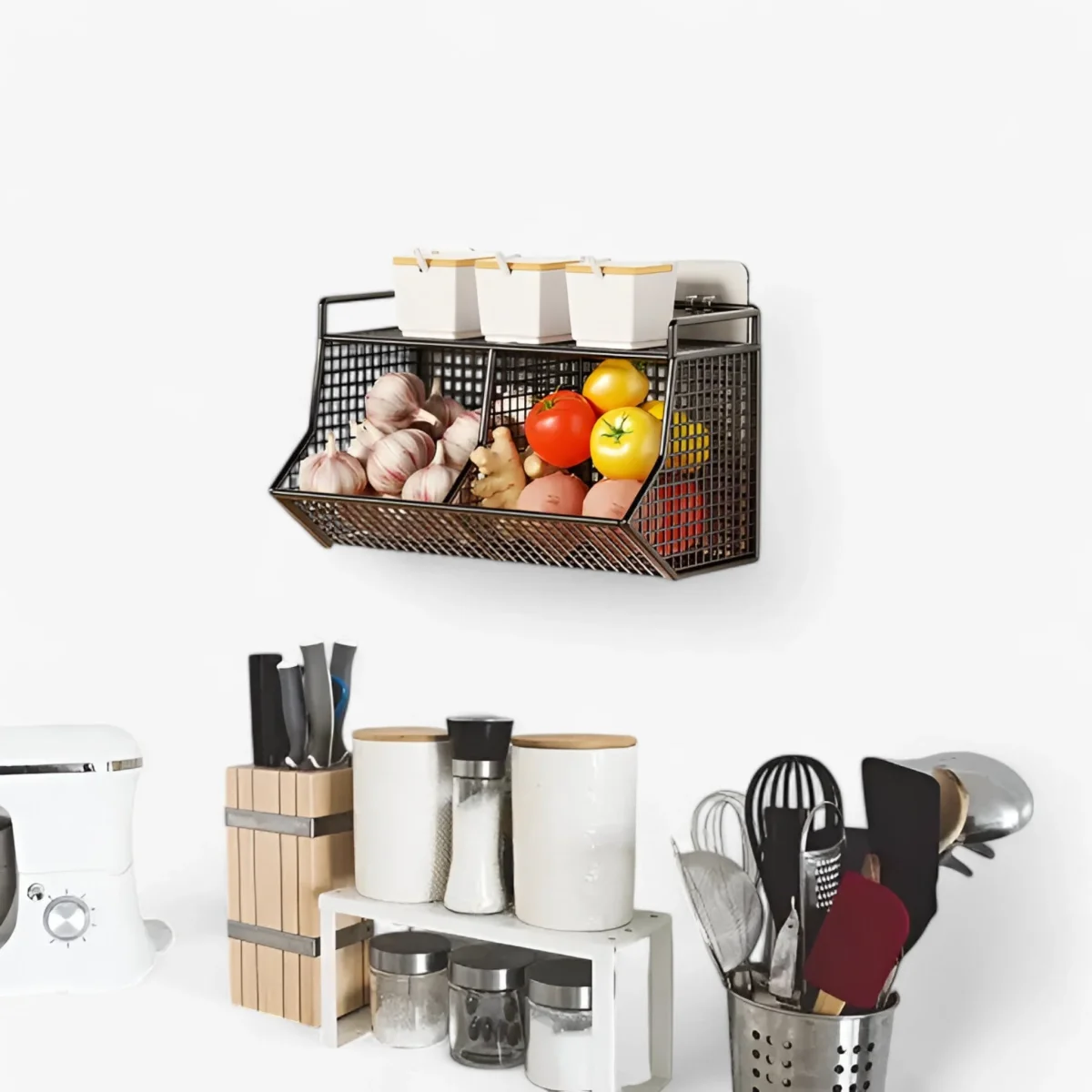 Deze veelzijdige organizer is eenvoudig aan elke muur te monteren en voegt onmiddellijk opslagcapaciteit toe aan je keuken, werkplaats, wasruimte of kast. Met opties voor één, twee of drie planken kun je je opbergruimte aanpassen aan je behoeften en kun je alles netjes georganiseerd en toegankelijk houden – van fruit en groenten tot handwerkmateriaal.