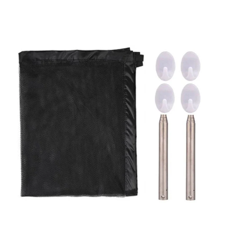 - Inclusief rol geweven stof, twee rekbare palen en vier klevende haken