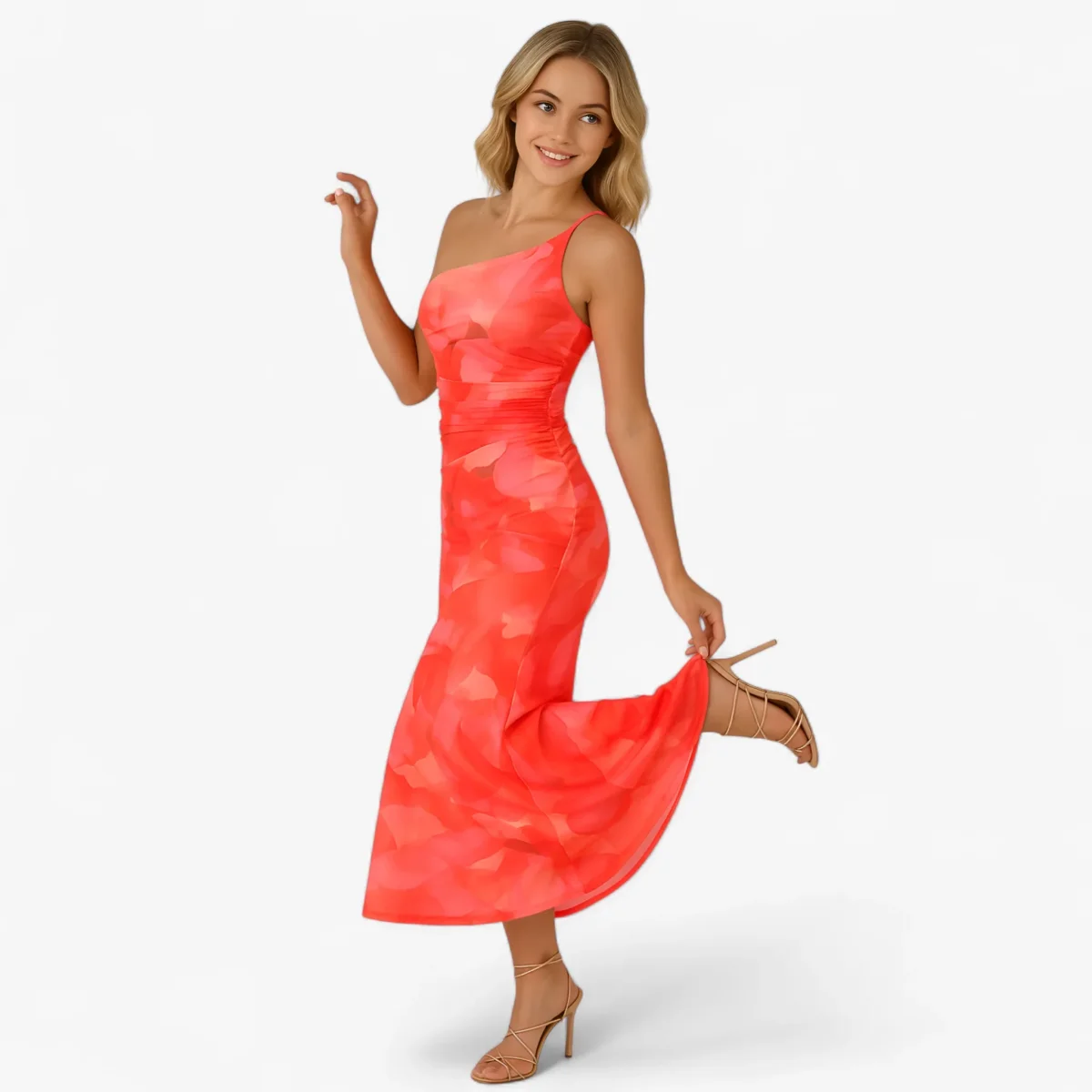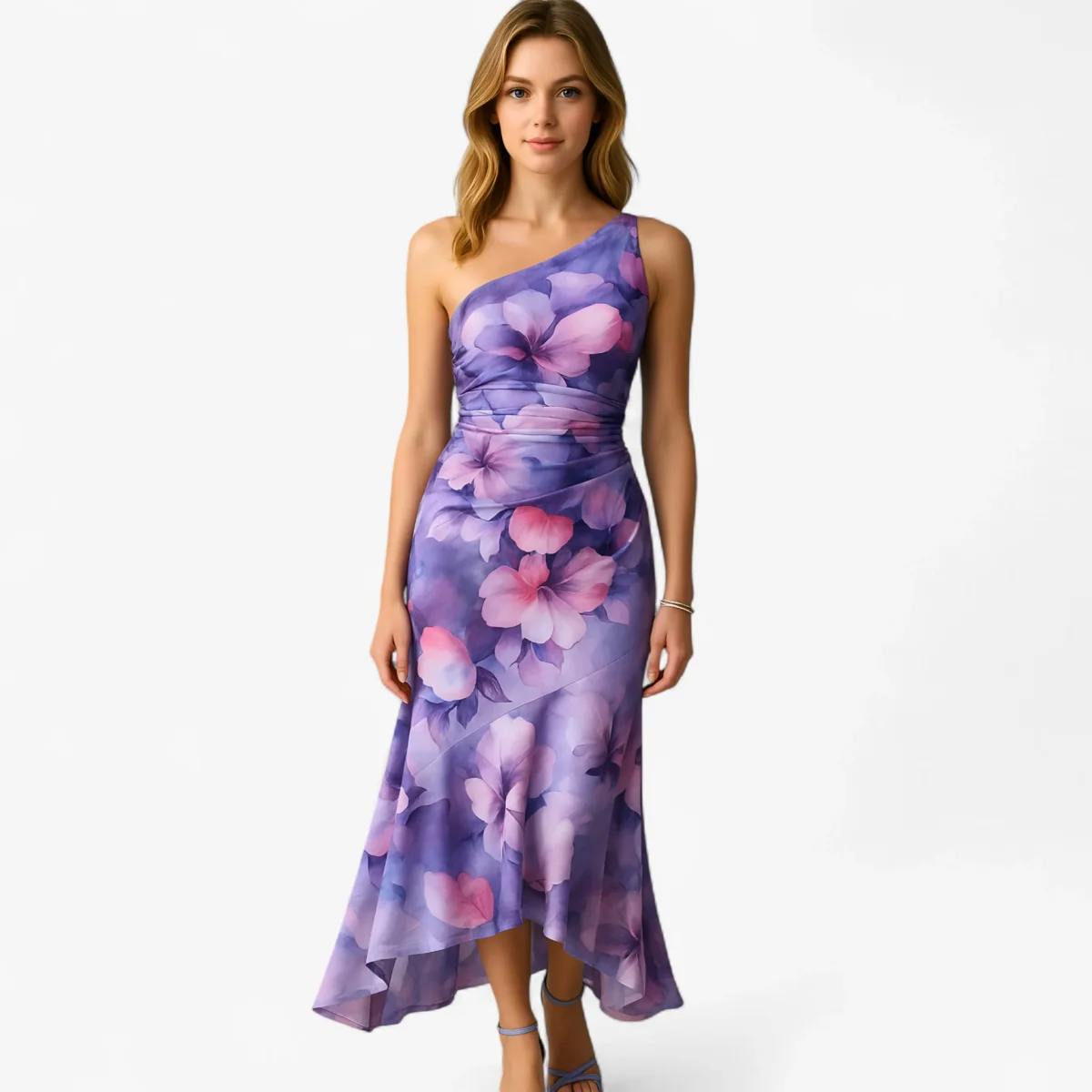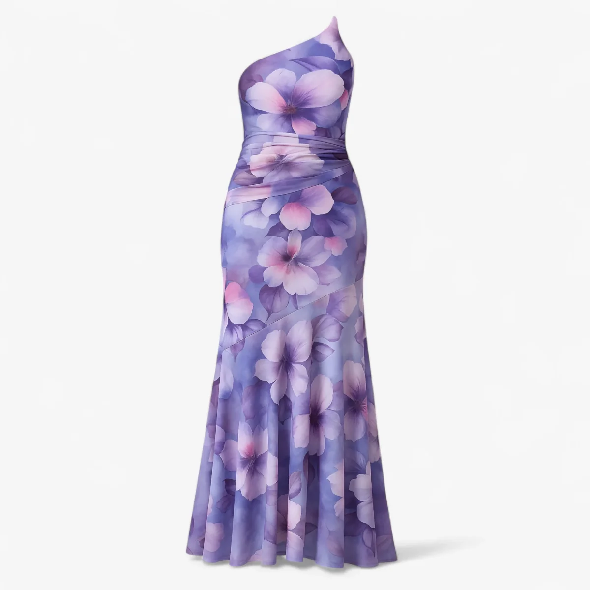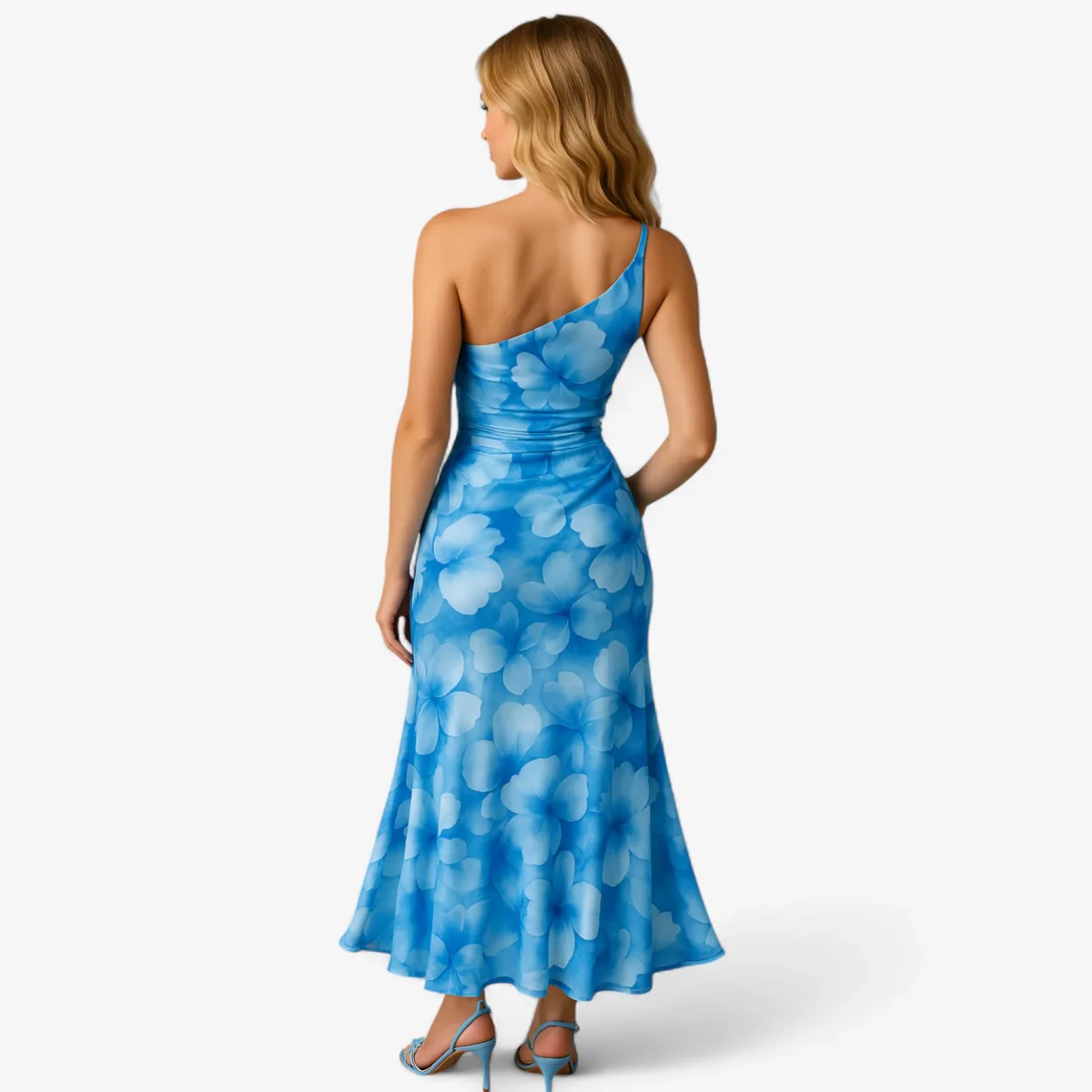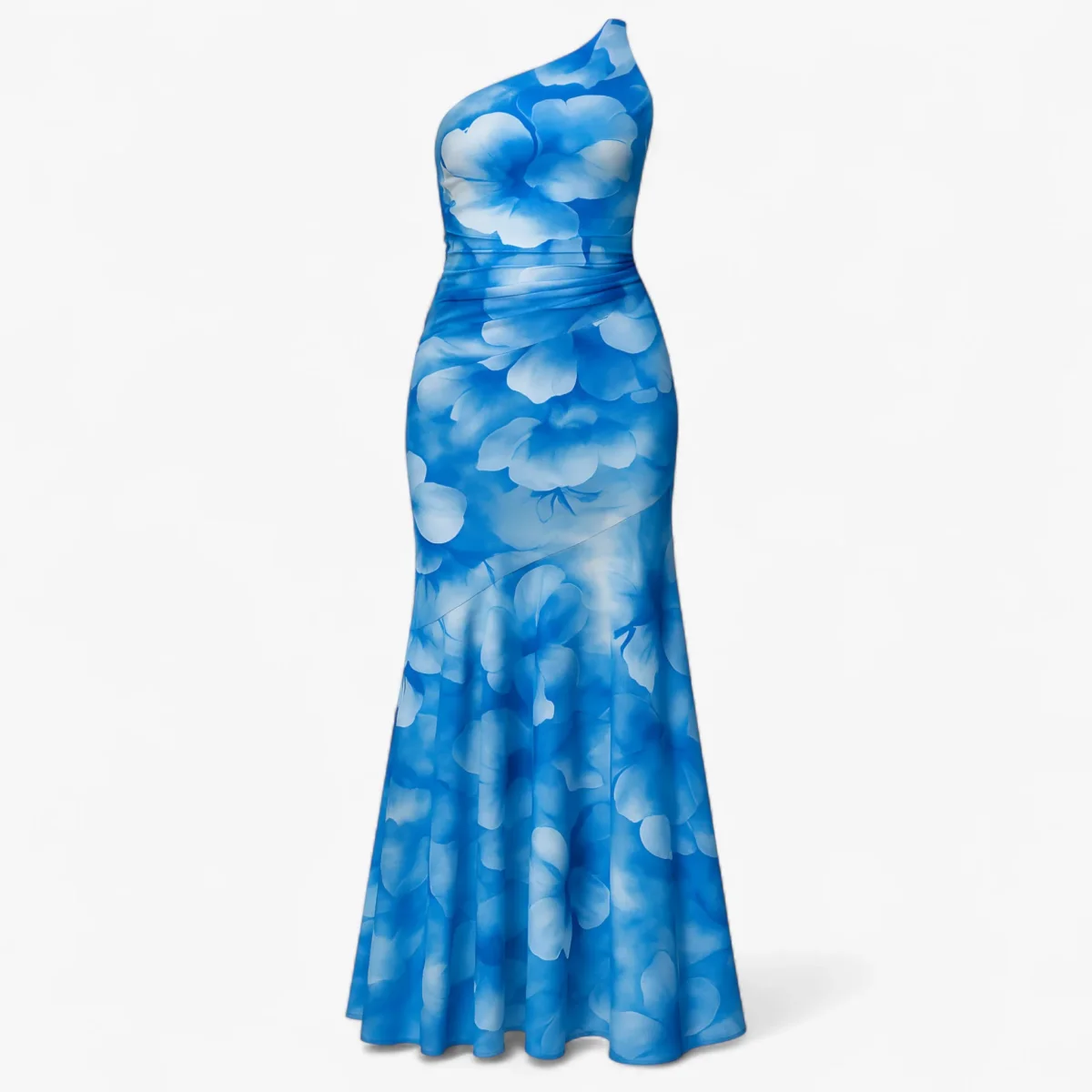 Deze elegante maxi-jurk met een enkele schouderband is perfect voor elke speciale gelegenheid. Het geplooide lijfje en de verlaagde zoom aan de achterkant zorgen voor een verfijnde en modieuze look.