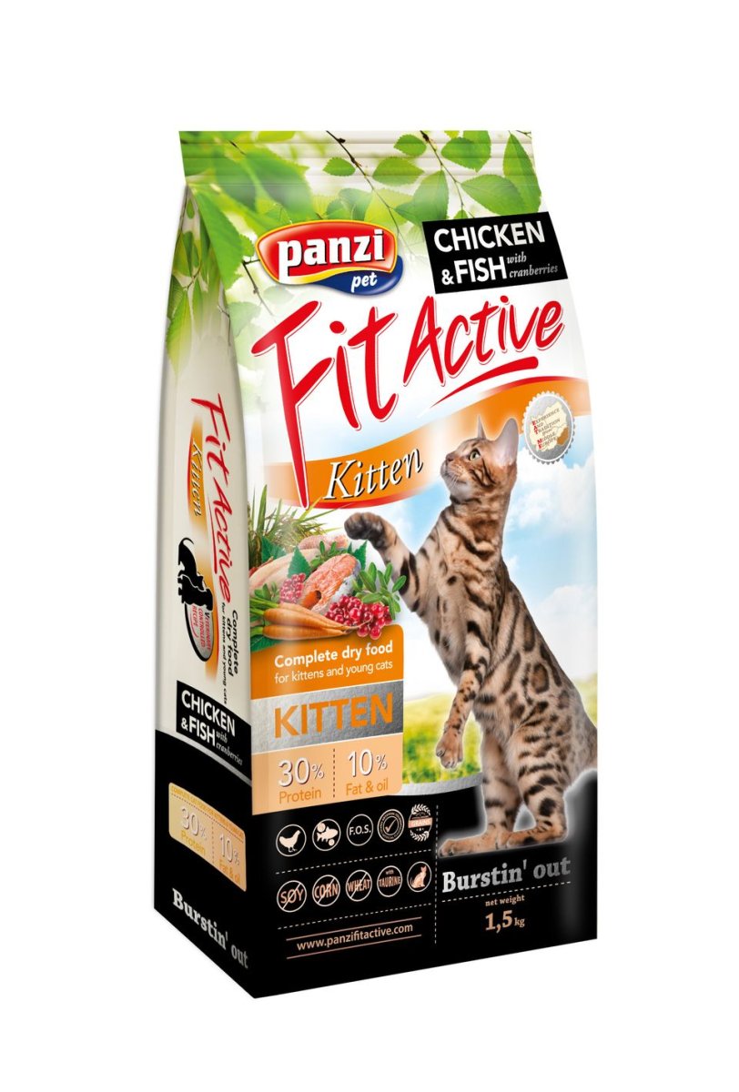 Fit Active kitten is een complete katten voeding voor kittens, zwangere en zogende katten. Voor een optimale groei hebben kittens een lekkere hoog kwalitatieve voeding nodig, dit is exact wat Fit Active kitten aanbiedt. Het product is gemaakt van waardevolle zalm en gevogelte vlees en voorziet dankzij zijn gevarieerde samenstelling alle nutriënten die uw kitten nodig heeft. Het is ook ideaal voor lang harige katten. Het bevat hoge gehaltes van natuurlijk taurines en kleine hoeveelheden fosfor zodat de pH waarde van de urine op een optimaal niveau blijft. De omega-3 en omega-6 vetzuren zorgen voor een gezonde groei, stralend bont, briljante ogen en een gezonde vacht. Dit product is gemaakt met rode sorghum en rijst, wat beiden hypoallergene granen zijn. Zo kunnen graan gevoelige katten deze voeding perfect verdragen. Naast een hele hoop vitaminen bevat dit product een hoog gehalte aan polyfenolen, een anti-oxidant, die het immuunsysteem boost en zorgt voor cel regeneratie.