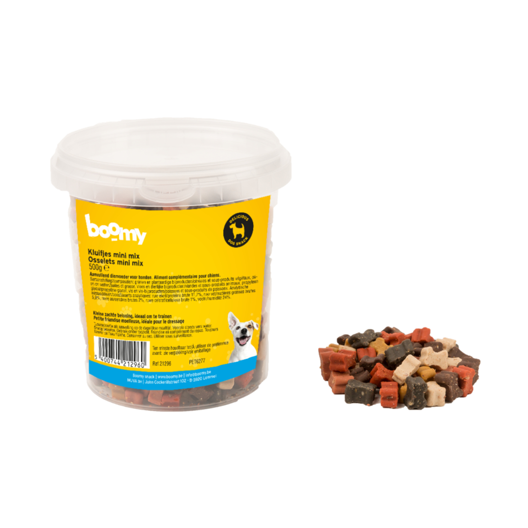 De Kluifjes Mini Mix is speciaal ontwikkeld voor pups, kleine hondenrassen of honden met een gevoelige beet. Deze kleurrijke, zachte minibotjes zijn slechts ongeveer 1,2 cm groot, wat ze ideaal maakt voor kleine bekjes en voor frequente beloningsmomenten tijdens training of spel.