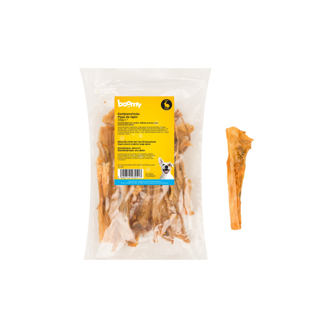 Kies voor variatie, lichtheid en kwaliteit met de Boomy konijnenhuid. De perfecte natuurlijke snack voor honden die gevoeliger zijn, maar niet willen inboeten op smaak of kauwplezier!