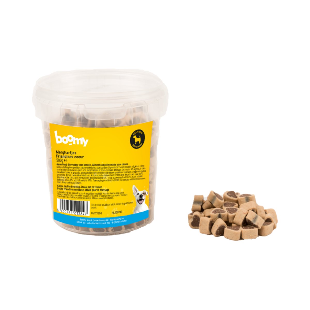 Deze kleine merghartjes met lam zijn een onweerstaanbare traktatie voor elke hond. Ze zitten verpakt in een handig hersluitbaar emmertje van 500 gram. Ze combineren een aantrekkelijke smaak met een zachte textuur. Hierdoor zijn ze geschikt zijn voor honden van alle leeftijden – van nieuwsgierige pups tot rustige senioren.