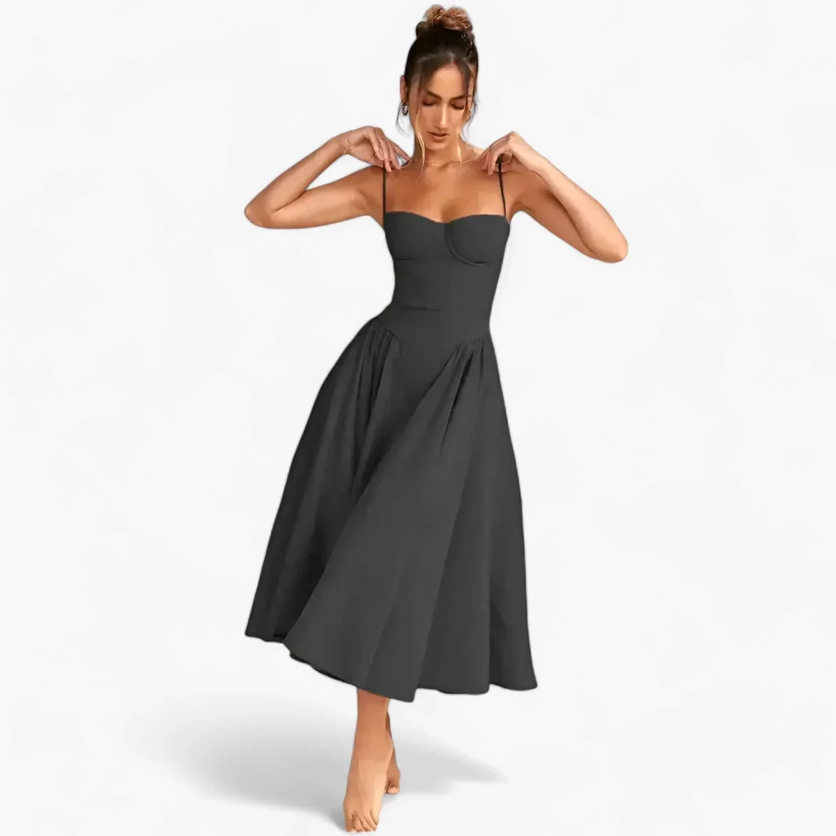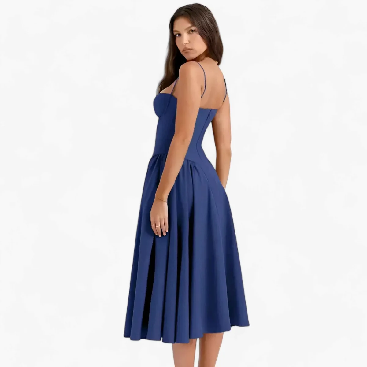 Deze mouwloze midi-jurk met korset is een must-have voor elke modebewuste vrouw. Het ontwerp combineert stijl en functionaliteit, waardoor je bij elke gelegenheid een verfijnde uitstraling hebt.