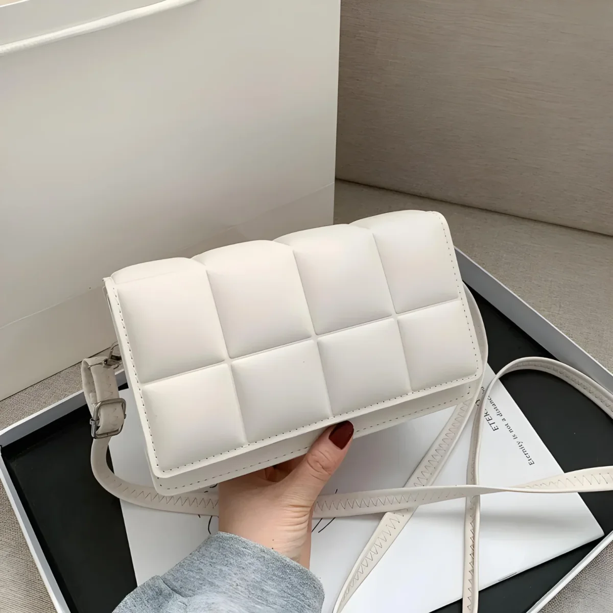 De Odette messenger-tas heeft een gewatteerd blokjespatroon dat doet denken aan luxe designertassen. De verstelbare schouderband en de flapklep maken hem praktisch en geschikt voor dagelijks gebruik.