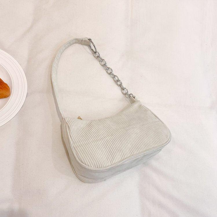 Een compacte baguettas in corduroy met een retro-sfeertje. De zilverkleurige ketting geeft de tas een speels detail.
