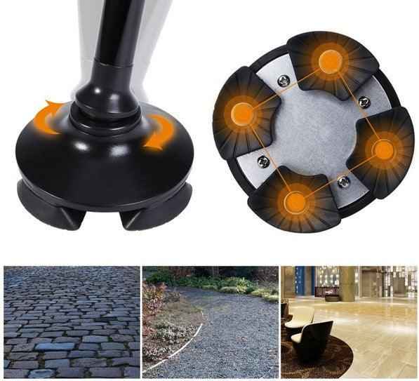 In tegenstelling tot andere wandelstokken met vier poten, biedt maximale stabiliteit aan de voet en voorkomt zo het risico van struikelen. De compacte ronde basis voorkomt kantelen en wegglijden dankzij vier rubberen stabilisatoren aan de onderzijde.