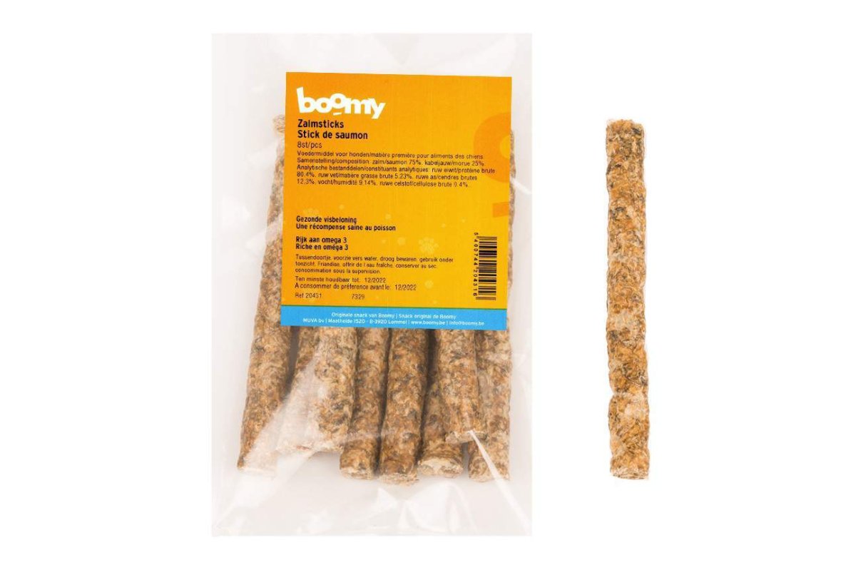 Geef je trouwe viervoeter een heerlijke en gezonde traktatie met onze zalmsticks, gemaakt van pure zalm- en kabeljauwhuid. Deze smakelijke sticks zijn verpakt per 8 stuks van 14cm en bieden niet alleen een geweldige smaak, maar ook essentiële voedingsstoffen voor een glanzende vacht en een gezonde huid.