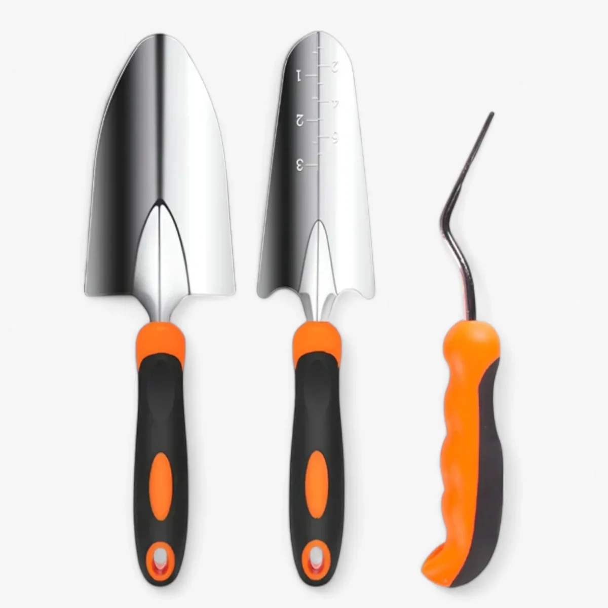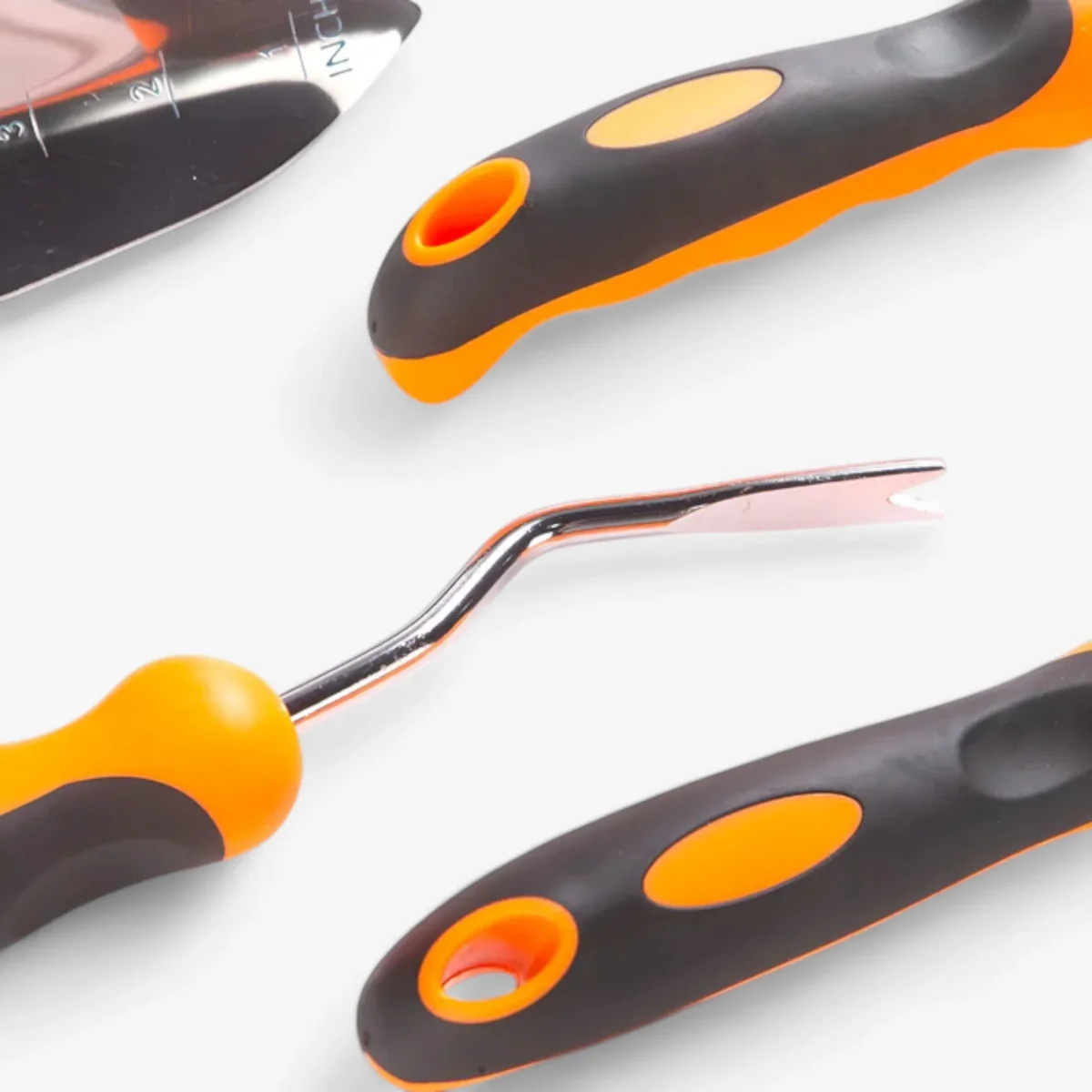 De tuingereedschapsset heeft anti-slip, ergonomische handvatten die zorgen voor comfort en de belasting op de handen verminderen tijdens lange werksessies. Geen wegglijden, geen pijnlijke handen – voor moeiteloos en precies werken.